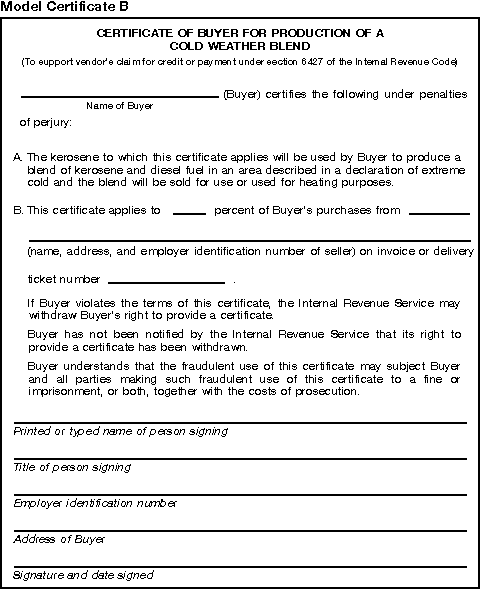 • An unexpired certificate from the buyer for each purchase of kerosene. See Model Certificate B.