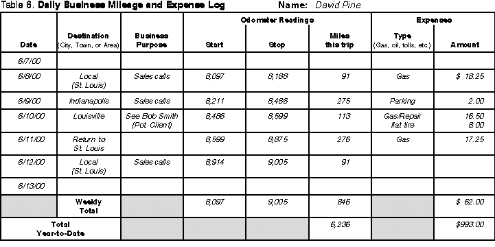 Example 1. David Pine purchased a car for $18,500 (including sales tax) on January 6, 2000. In 2000, he used the car 70% for business purposes. A sample page from David's logbook is illustrated in Table 6. He records his business mileage (but not his personal miles) and expenses daily.