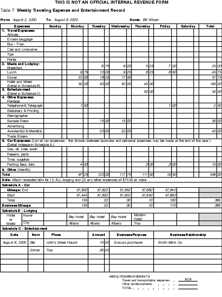 Bill purchased his car on January 3, 1997. He uses the standard mileage rate for car expense purposes. He records his total mileage, business mileage, parking fees, and tolls for the year. Bill records his expenses and other pertinent information in his Weekly Traveling Expense and Entertainment Record, shown in Table 7. He obtains receipts for his expenses for lodging and for any other expenses of $75 or more.