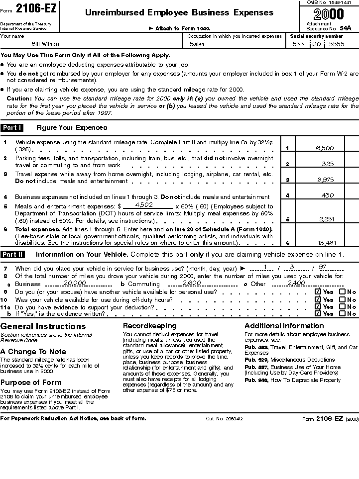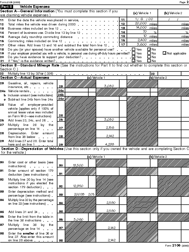 During the year, Bill drove a total of 25,000 miles of which 20,000 miles were for business. Following the instructions for Part II of Form 2106, he answers all the questions and figures his car expense to be $6,500 (20,000 business miles x 32 1/2 cents standard mileage rate.