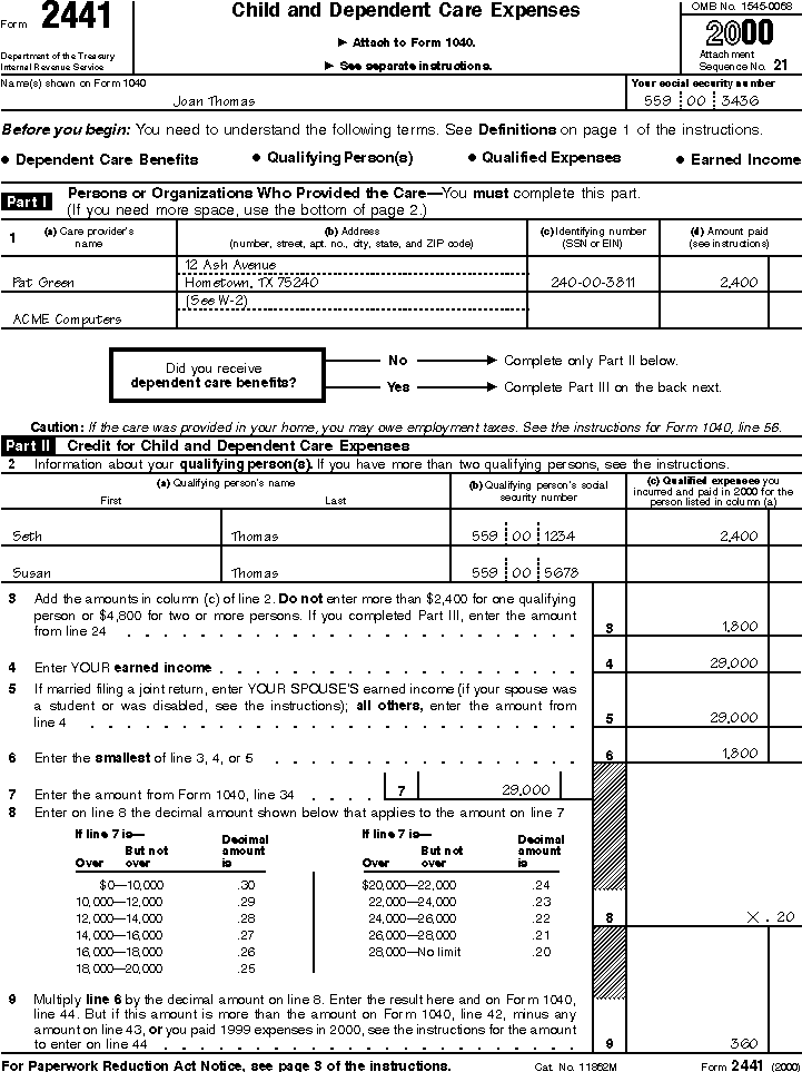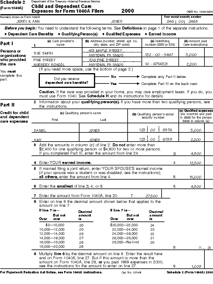 The following examples show how to figure the credit for child and dependent care expenses. A filled-in page 1 of Schedule 2 (Form 1040A) that illustrates Example 1 and a filled-in Form 2441 (filed with Form 1040) that illustrates Example 2 are shown after the examples.