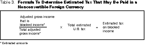 Figuring estimated tax on nonconvertible foreign currency. If you are liable for estimated tax (discussed later), figure the amount you can pay to IRS in nonconvertible foreign currency using the formula in Table 3.