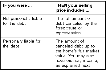 You figure the gain or loss from the sale in generally the same way as gain or loss from any sale. But the amount of your gain or loss depends, in part, on whether you were personally liable for repaying the debt secured by the home, as shown in the following chart.