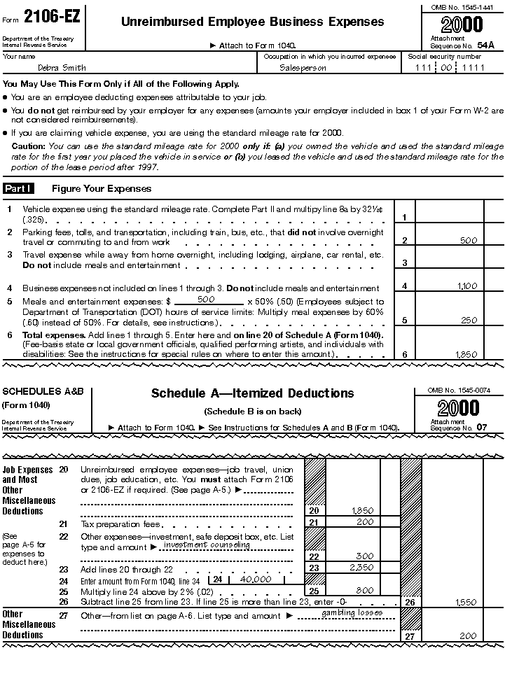 Her filled-in Form 2106-EZ and part of her Schedule A (Form