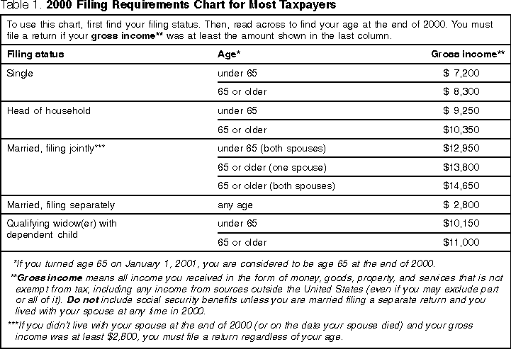 Table 1. 2000 Filing Requirements Chart for Most Taxpayers