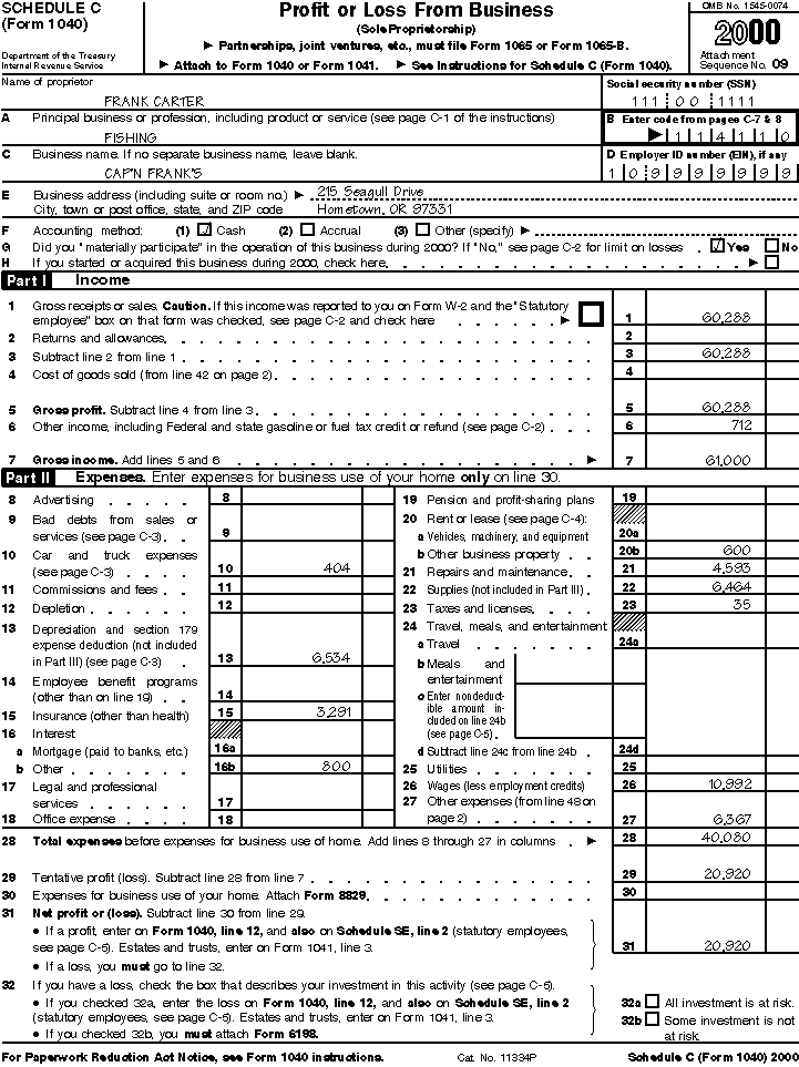 Frank figures his net profit or loss from his fishing business by subtracting his fishing expenses from his gross income from fishing on Schedule C. He then reports the net profit or loss on line 12, Form 1040.