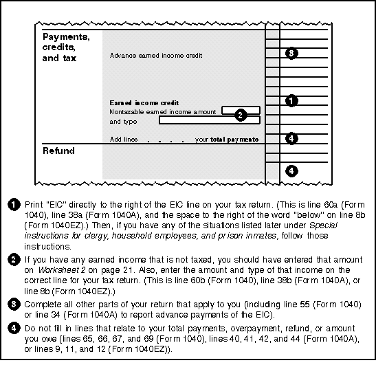 Tip:If you want the IRS to figure your income tax, see Publication 967, The IRS Will Figure Your Tax. The IRS will figure your EIC for you if you follow the instructions in Figure 3 below. If you have a qualifying child, complete and attach Schedule EIC. If you want to figure the credit yourself, use EIC Worksheet A or B, whichever applies.