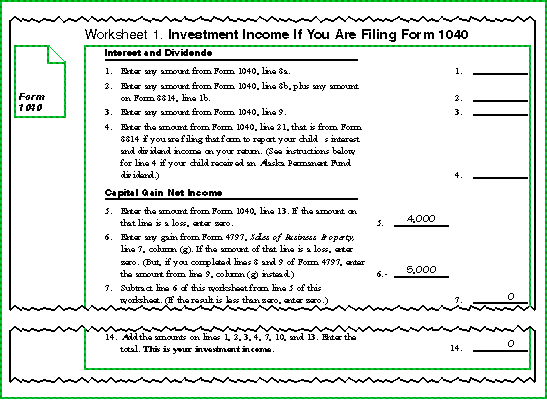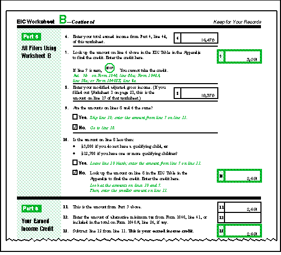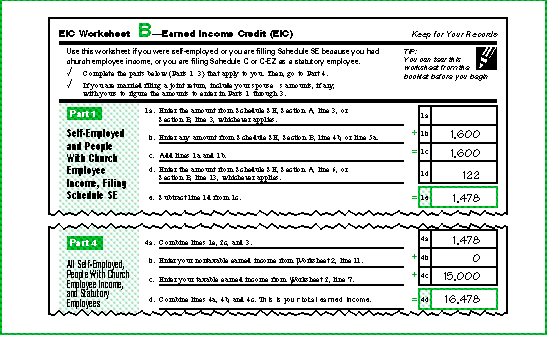 The Greens read Publication 596 to see if they can claim the EIC. They use Worksheet 1 (shown here) to figure their investment income, which is zero. They use Worksheet 3 (not shown) to figure their modified AGI. They start with their AGI of $16,878 ($15,000 + $4,000 - $2,000 - $122). When they add 75% of their farm loss to their AGI, they find their modified AGI is $18,378 ($16,878 + $1,500). They find that they are eligible to get the EIC. They use EIC Worksheet B (shown here) to figure their EIC of $2,691. They also complete Schedule EIC (not shown) and attach it to their Form 1040.