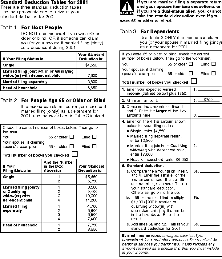 Standard Deduction Tables for 2001