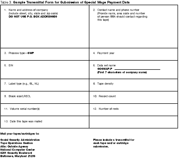 Table 3. Sample Transmittal Form for Submission of Special Wage Payment Data