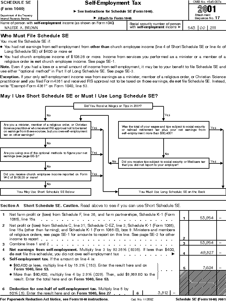 Lines 5 and 6. He multiplies line 4 by 15.3% and enters $7,624 on line 5. This is his self-employment tax for 2001. He also enters $7,624 on line 53 of Form 1040. He enters $3,812 on line 6 and also on line 27 of Form 1040 (deduction for one-half of his self-employment tax).