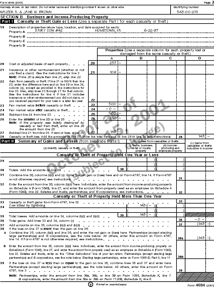 Mr. Brown's only business casualty occurred on July 7 when a dairy cow he purchased 4 years ago was killed by lightning. He shows the loss from the casualty on page 2 of Form 4684. Only page 2 is shown, since page 1 is for nonbusiness casualties.