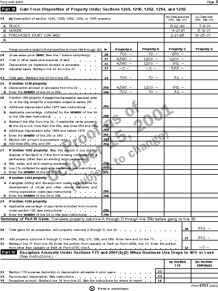 Part III. Mr. Brown sold three depreciable assets in 2001 at a gain. They consisted of a truck, a mower, and purchased dairy cow #60. He has information about their cost and depreciation in his records. Only the dairy cow appears on the Depreciation Worksheet. The truck and mower were fully depreciated.