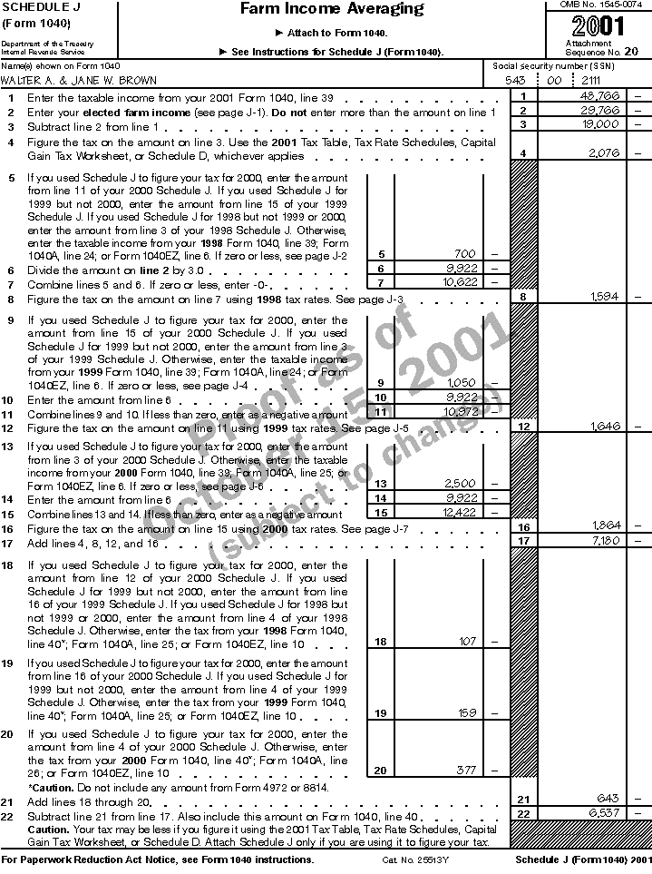 In 2001, Mr. Brown's taxable income, $48,766, is substantially higher than in each of the 3 previous years. His taxable income amounts were only $2,500, $1,050, and $700 for 2000, 1999, and 1998, respectively. He elects to use farm income averaging by completing Schedule J to figure his tax.