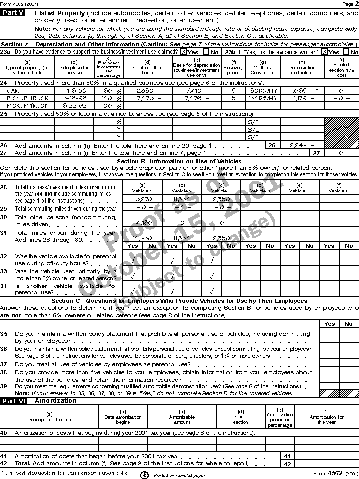 Mr. Brown follows the instructions and lists the information called for in Parts I through IV. He also completes Part V on page 2 to provide information on listed property used in his farming business. The three vehicles used in his business are listed property. The truck, sold in July and shown on Form 4797, was placed in service in 1992 and fully depreciated in 1997. No depreciation is allowed for 2001.