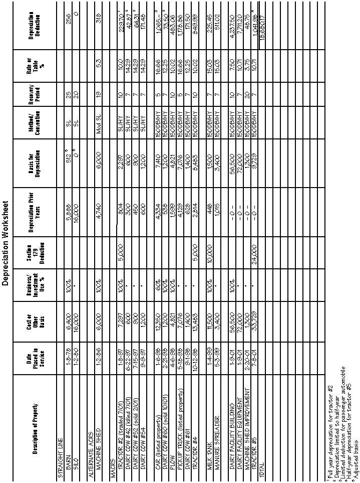 The Depreciation Worksheet contains an itemized list of Mr. Brown's assets for which he is deducting depreciation in 2001. He must list each item separately to keep track of its basis. The pickup truck and car purchased in 1998 are listed property in the 5-year property class.