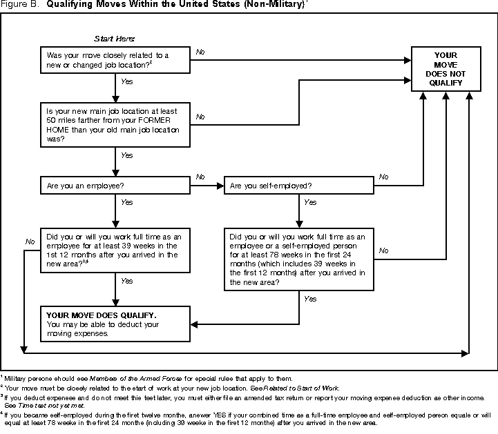 You can deduct your allowable moving expenses if your move is closely related to the start of work. You also must meet the distance test and the time test. These two tests are discussed later. After you have read the time and distance test rules, you may want to use Figure B to help you decide if your move qualifies for deducting your moving expenses.