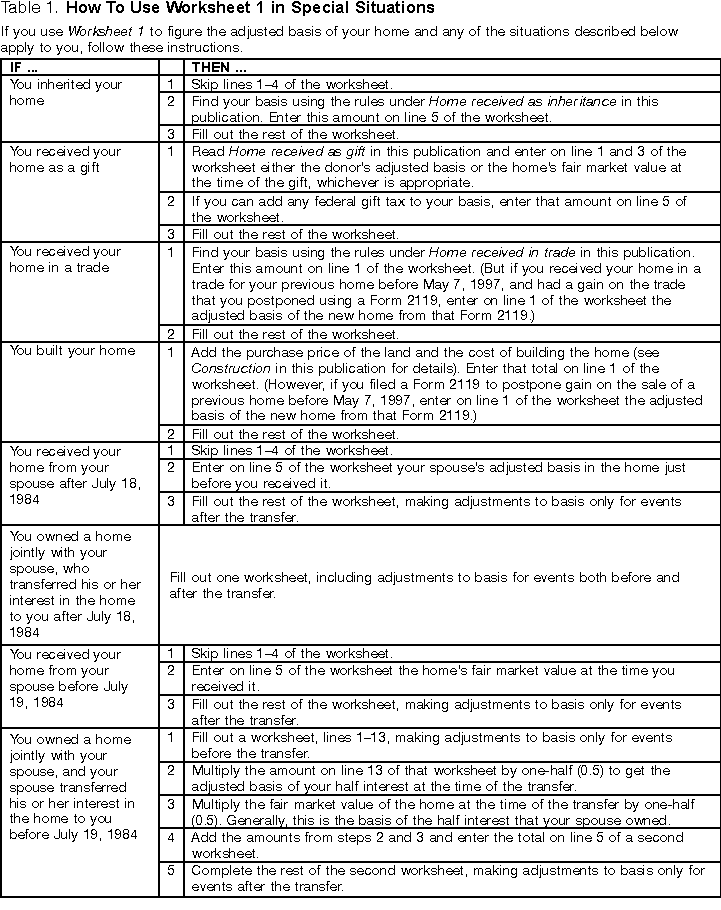 Table 1. How to Use the Adjusted Basis of Home Sold Worksheet in Special Situations