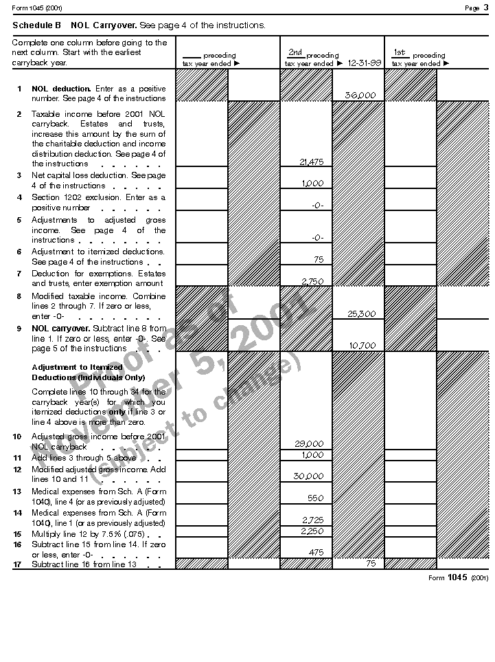 The following example illustrates how to figure an NOL carryover from a carryback year. It includes a filled-in Schedule B (Form 1045).
