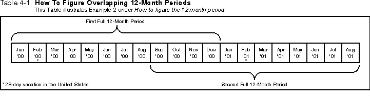 Example 2. You work in New Zealand for a 20-month period from January 1, 2000, through August 31, 2001, except that you spend 28 days in February 2000 and 28 days in February 2001 on vacation in the United States. You are present in New Zealand 330 full days during each of the following two 12-month periods: January 1, 2000 -- December 31, 2000, and September 1, 2000 -- August 31, 2001. By overlapping the 12-month periods in this way, you meet the physical presence test for the whole 20-month period. See Table 4-1.