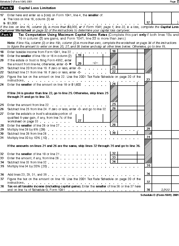 Since the estate had a net capital gain and taxable income, you use Part V of Schedule D (Form 1041) and the Schedule D Worksheet to figure the