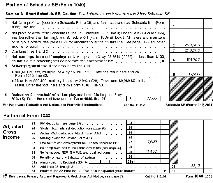 Example. You are a sole proprietor and have employees. The terms of your plan provide that you contribute 8 1/2% (.085) of your compensation and 8 1/2% of your participants' compensation. Your net profit from line 31, Schedule C (Form 1040) is $200,000. In figuring this amount, you deducted your common-law employees' compensation of $100,000 and contributions for them of $8,500 (8 1/2% x $100,000). Your self-employment tax deduction on line 27 of Form 1040 is $7,663. See the filled-in portions of both Schedule SE (Form 1040), Self-Employment Income, and Form 1040, later.