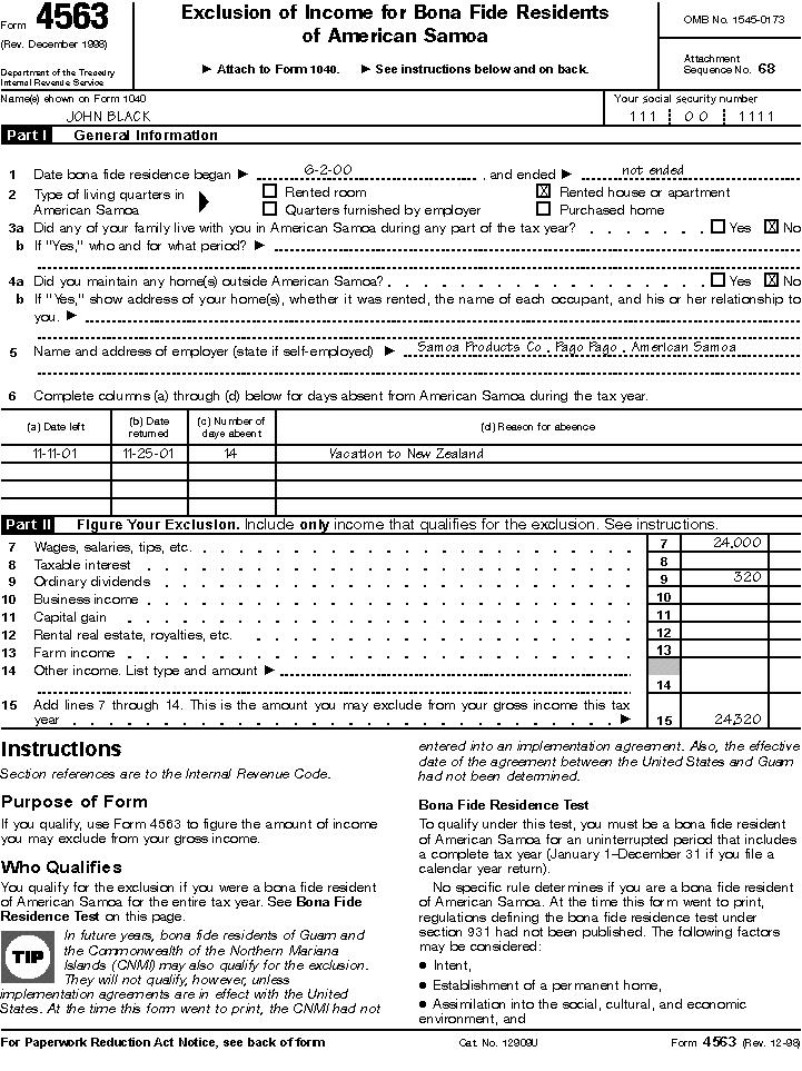John Black is a U.S. citizen and was a bona fide resident of American Samoa during all of 2001. He has to file Form 1040 because his gross income from sources outside the possessions ($8,000 of dividends from U.S. corporations) is at least the total of his personal exemption and allowable standard deduction for single filers. (See Filing Tax Returns, earlier.) Because he has to file Form 1040, he fills out Form 4563 to determine the amount of possession income he can exclude.