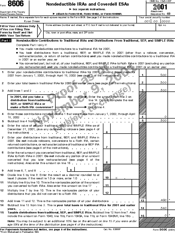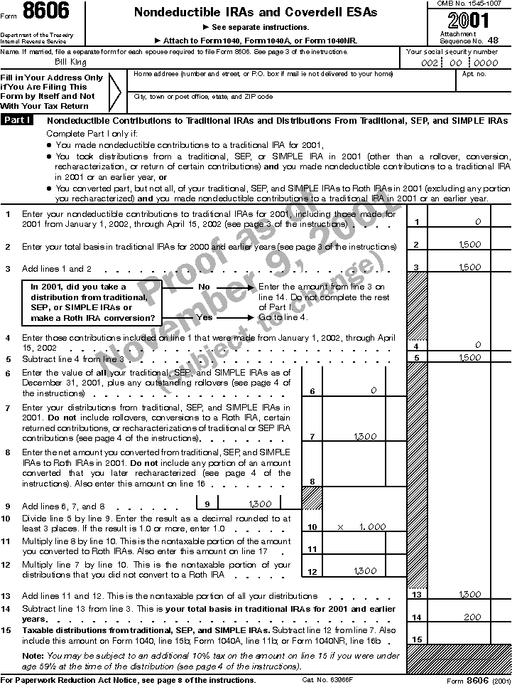 Example. Bill King has made nondeductible contributions to a traditional IRA totaling $2,000, giving him a basis at the end of 2000 of $2,000. By the end of 2001, his IRA earns $400 in interest income. In that year, Bill receives a distribution of $600 ($500 basis + $100 interest), reducing the value of his IRA to $1,800 ($2,000 + 400 - 600) at year's end. Bill figures the taxable part of the distribution and his remaining basis on Form 8606 (illustrated).
