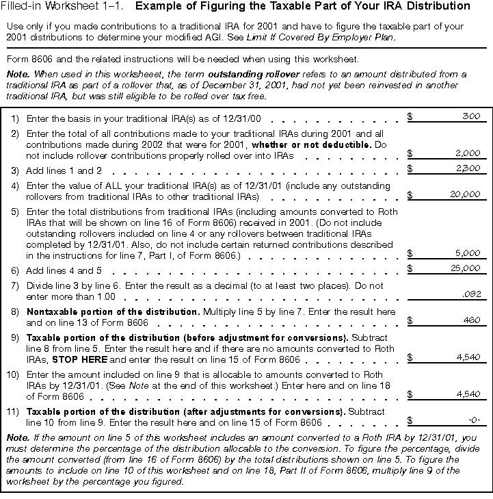 Contribution and distribution in the same year. If you received a distribution in 2001 from a traditional IRA and you also made contributions to a traditional IRA for 2001 that may not be fully deductible because of the income limits, you can use Worksheet 1-1 to figure how much of your 2001 IRA distribution is tax free and how much is taxable. Then you can figure the amount of nondeductible contributions to report on Form 8606. Use the related instructions, under Reporting your nontaxable distribution on Form 8606, later, to figure your remaining basis after the distribution.