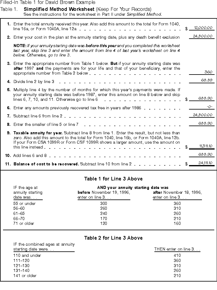 TaxTip: Instead of Table 1, you can generally use the Simplified Method Worksheet in the instructions for Form 1040 or Form 1040A to figure your taxable annuity. However, you must use Table 1 and Table 2 in this publication if you chose the alternative annuity option. See Alternative Annuity Option, later.