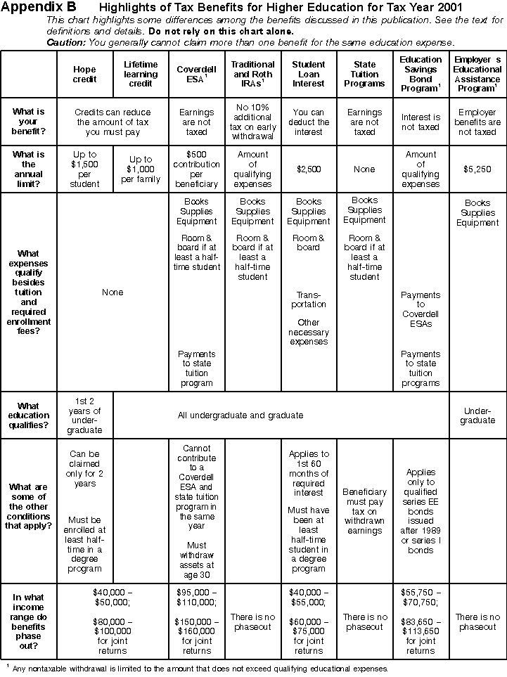 2. Appendix B-- A chart summarizing some of the differences between the different higher education tax benefits discussed in this publication. It is intended only as a guide. Look in the publication for more complete information.