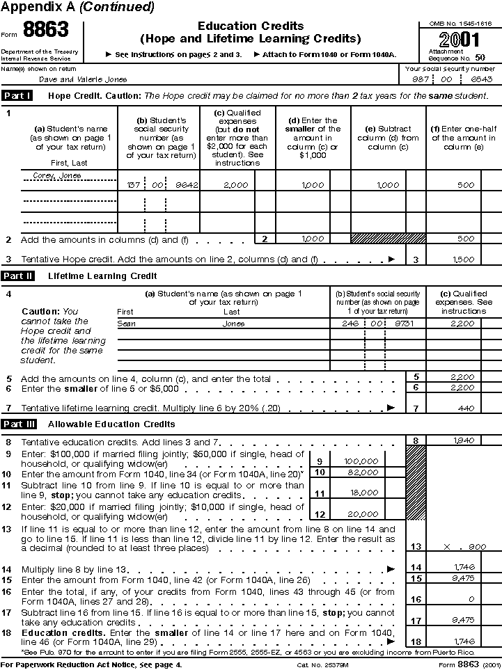 1. Appendix A-- An Illustrated Example of Education Credits including a filled-in Form 8863 showing how to claim both the Hope credit and lifetime learning credit for 2001.