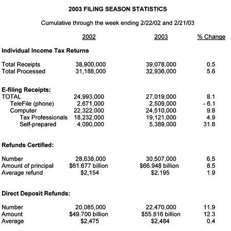 "We are off to a strong start for the Free File program. For 1.3 million taxpayers, the benefits of Free File are invaluable. It's giving more people free access to the benefits of e-filing. IRS e-file is the fast, easy and accurate way to file your tax return, said Acting IRS Commissioner Bob Wenzel. Among other highlights for the 2003 filing season through late February: