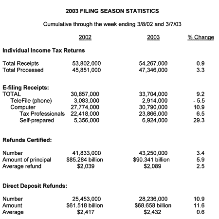 WASHINGTON - The Internal Revenue Service continues to receive more tax returns electronically, with especially big increases in taxpayers e-filing from their own computers almost 7 million, up nearly 30 percent over this time last year and for those e-filing federal and state returns together more than 14.4 million, up 14 percent.
