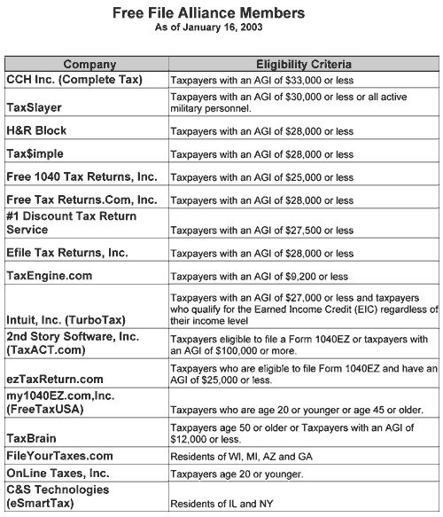 At the Free File homepage, taxpayers have two options for determining their eligibility for free services: They may browse the complete listing of Alliance members and their free services. Or, taxpayers can use a questionnaire application, the Free File Wizard, which will assist taxpayers in identifying those free services for which they may qualify. Each Alliance member will identify their company name and will have a simple description of the criteria for using their free service. Each Alliance member´s company or product name will be linked to additional information about the company and services. Not all taxpayers will be eligible for these free services.
