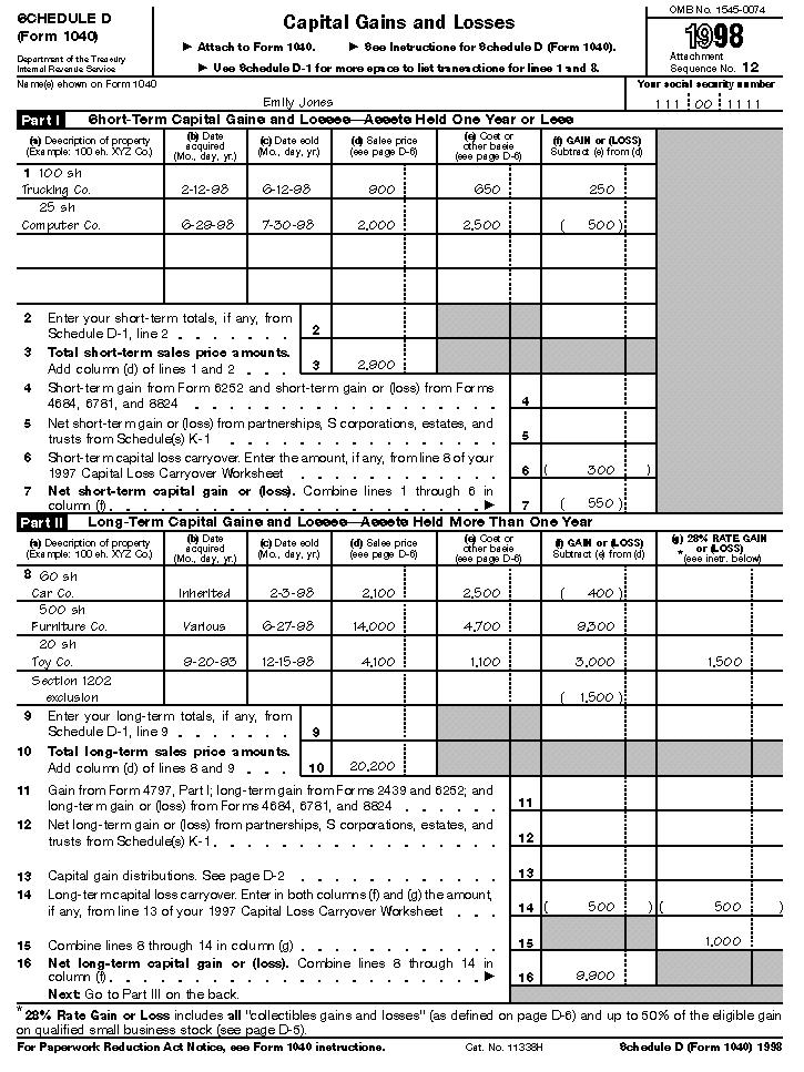 Emily Jones is single and, in addition to wages from her job, she has income from some stocks and other securities. For the 1998 tax year, she had the following capital gains and losses, which she reports on Schedule D. All the Forms 1099 she received showed net sales prices. Her filled-in Schedule D is shown in this chapter.
