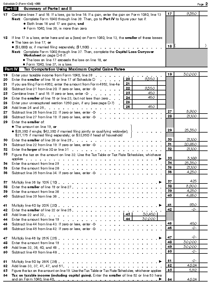 Tax computation using maximum capital gains rates. Because Emily has gains on both lines 16 and 17 of Schedule D and has taxable income, she uses Part IV of Schedule D to figure her tax. She had already filled out her Form 1040 through line 39 and enters the amount from that line, $30,000, on line 19 of Schedule D. After filling out the rest of Part IV, she finds that her tax is $4,524. This is less than the tax she would have found using the Tax Table, $5,112.