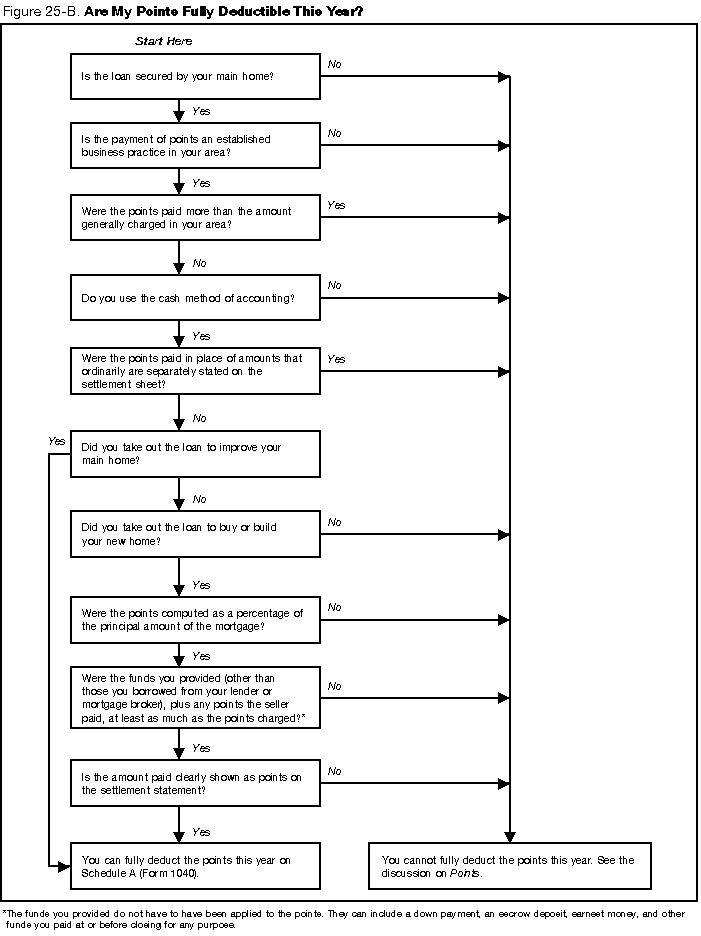 Figure 25-B. You can use Figure 25-B as a quick guide to see whether your points are fully deductible in the year paid. If you do not qualify under the exception to deduct the full amount of points in the year paid, see Points in chapter 8 of Publication 535, Business Expenses, for the rules on when and how much you can deduct. However, if the points relate to refinancing a home mortgage, see Refinancing, later.