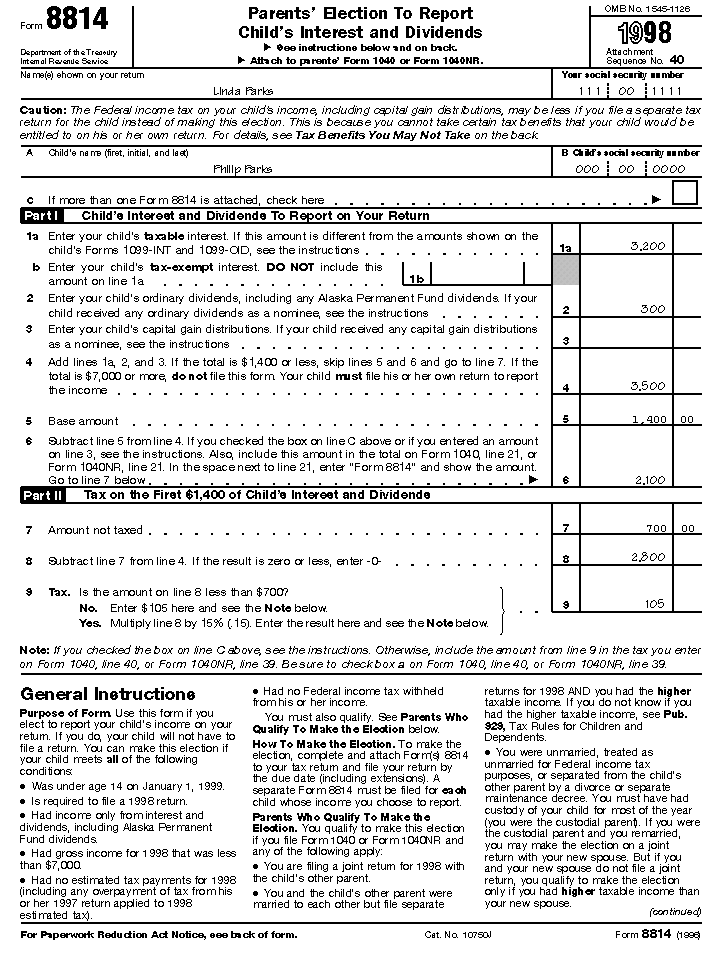 David and Linda Parks are married and will file separate tax returns for 1998. Their only child, Philip, is 8. Philip received a Form 1099-INT showing $3,200 taxable interest income and a Form 1099-DIV showing $300 ordinary dividends. His parents decide to include that income on one of their returns so they will not have to file a return for Philip.