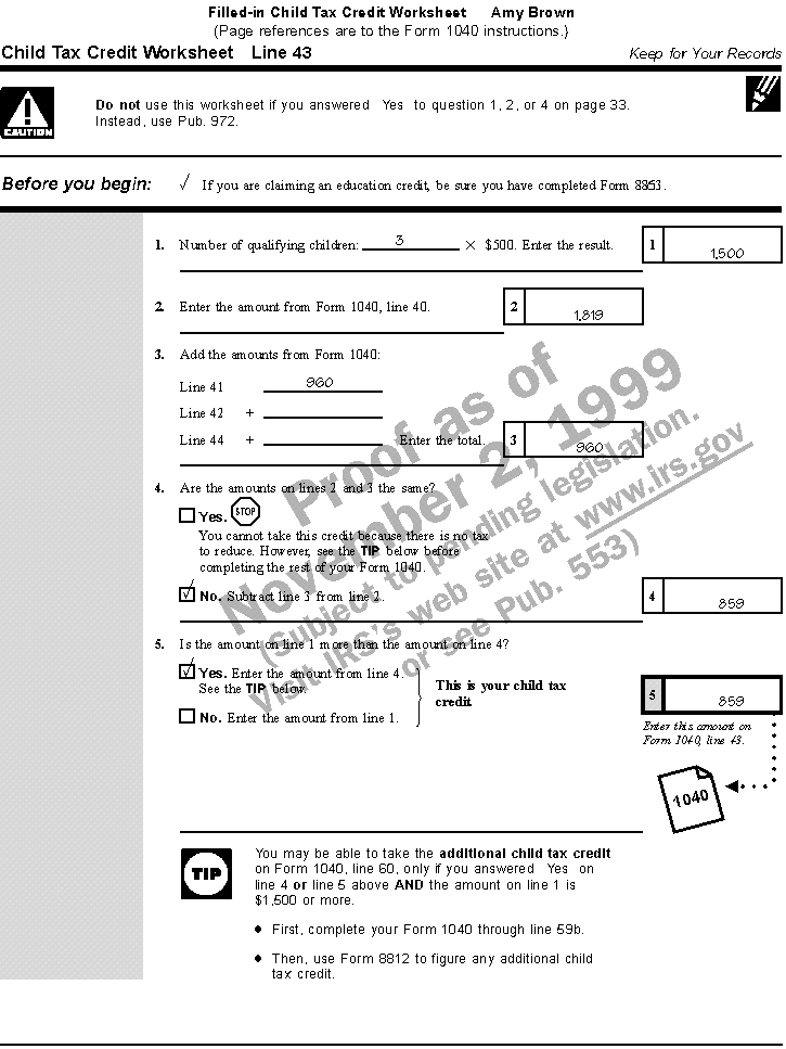 Filled-in child tax credit worksheet