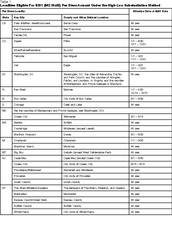Localities Eligible for $201 ($42 M & IE) Per Diem Amount Under the High-low Substantiation Method