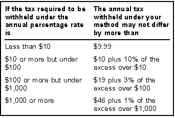 Other methods. You may use other methods and tables for withholding taxes, as long as the amount of tax withheld is consistently about the same as it would be under the percentage method shown in Circular E. If you develop an alternative method or table, you should test the full range of wage and allowance situations to be sure that they meet the tolerances contained in Regulations section 31.3402(h)(4)-1 as shown in the chart below.