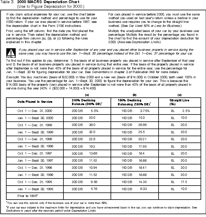 Example. In 1995, you bought a car for exclusive use in your business. The car cost $14,000. From 1995 through 2000, you used the standard mileage rate to figure your car expense deduction. You drove your car 14,100 miles in 1995, 16,300 miles in 1996, 15,600 miles in 1997, 16,700 miles in 1998, 15,100 miles in 1999, and 14,900 miles in 2000. Your depreciation is figured as follows.