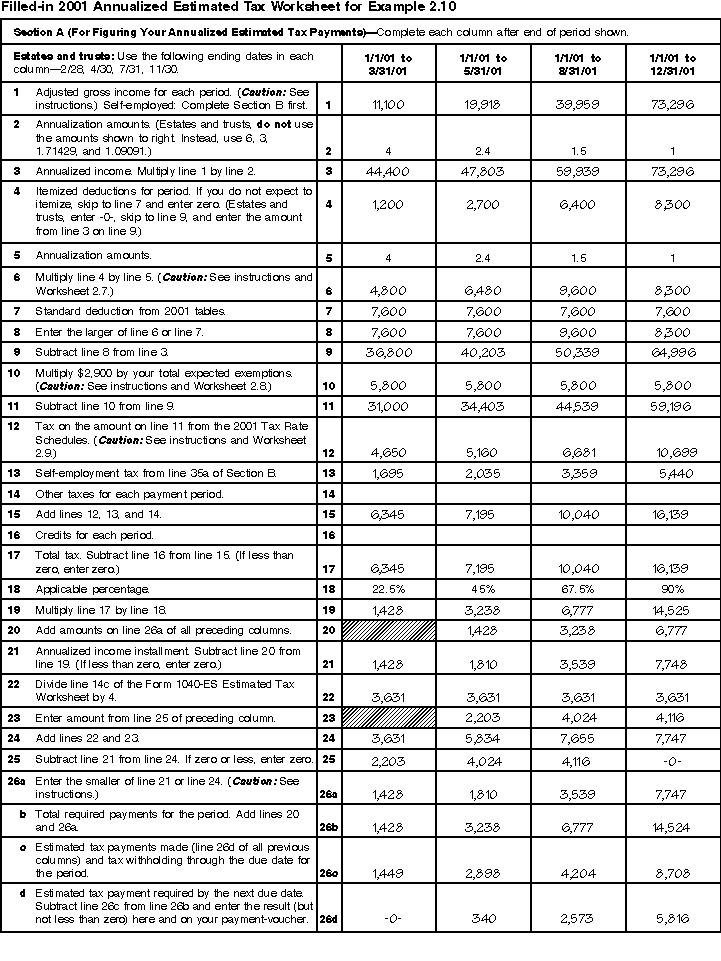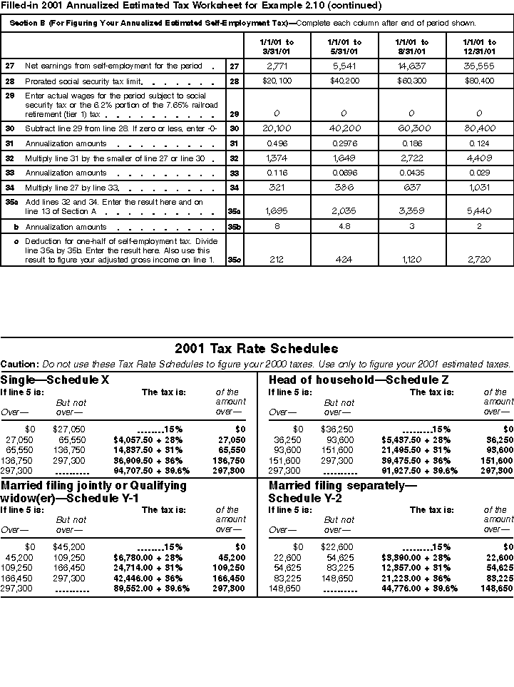 Filled-in Annualized Estimated Tax Worksheets and 2001 Tax Rate Schedules