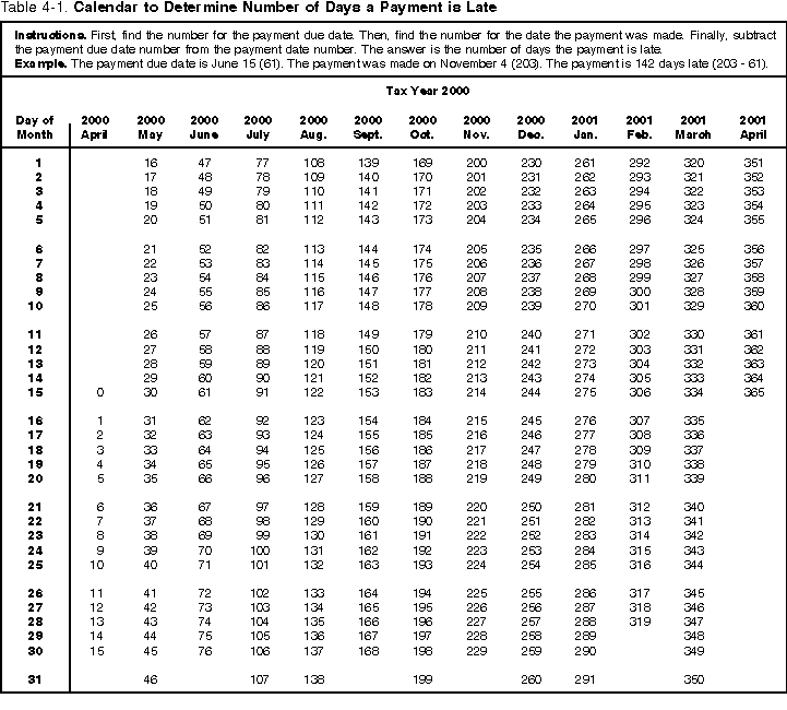 Aid for counting days. Table 4-1 provides a simple method to count the number of days between payment dates or between a due date and a payment date.