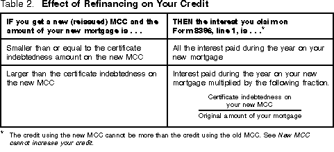If you refinance your original mortgage loan on which you had been given an MCC, you must get a new MCC to be able to claim the credit on the new loan. And the amount of credit you can claim on the new loan may change. Table 2 summarizes how to figure your credit if you refinance your original mortgage loan.
