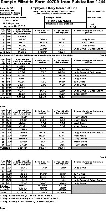 If you keep a tip diary, you can use Form 4070A, Employee's Daily Record of Tips. To get Form 4070A, ask the Internal Revenue Service (IRS) or your employer for Publication 1244, Employee's Daily Record of Tips and Report to Employer. Publication 1244 includes a year's supply of Form 4070A. Each day, write in the information asked for on the form. A filled-in Form 4070A is shown on this page.