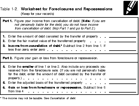 You can use Table 1-2 to figure your gain or loss from a foreclosure or repossession.