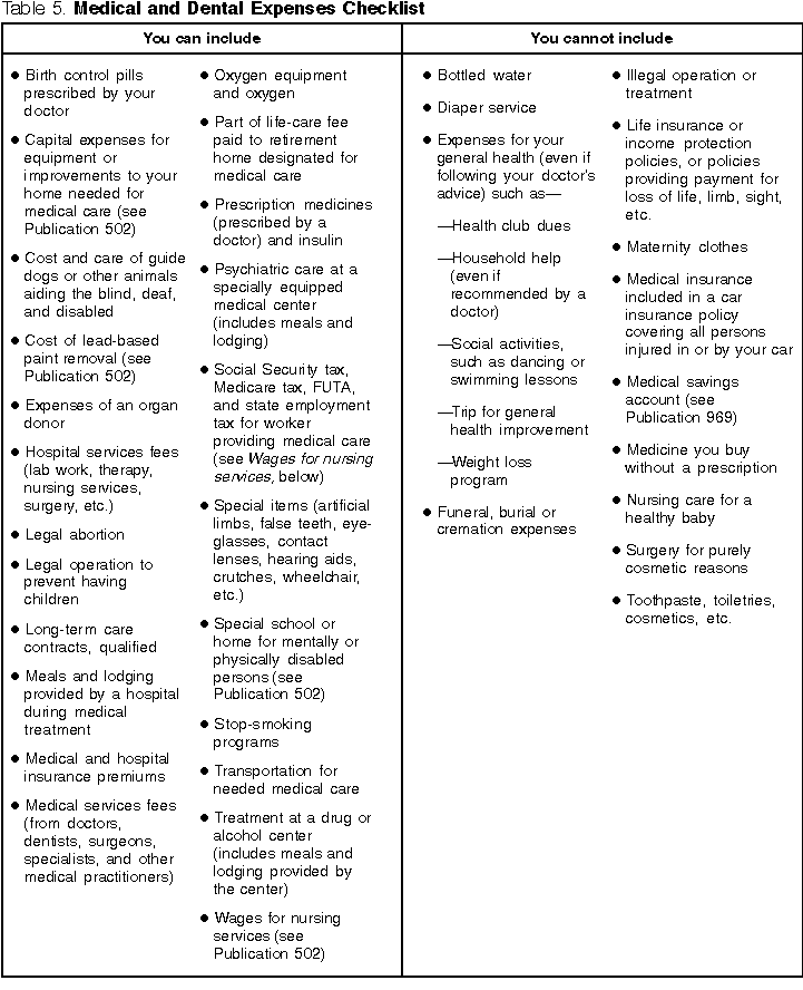 Table 5 shows items that you can or cannot include in figuring your medical expense deduction. More information can be found in Publication 502, Medical and Dental Expenses.