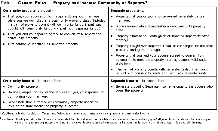 The laws of the state in which you are domiciled generally govern whether you have community property and community income or separate property and separate income for federal tax purposes. Table 1 summarizes the general rules.